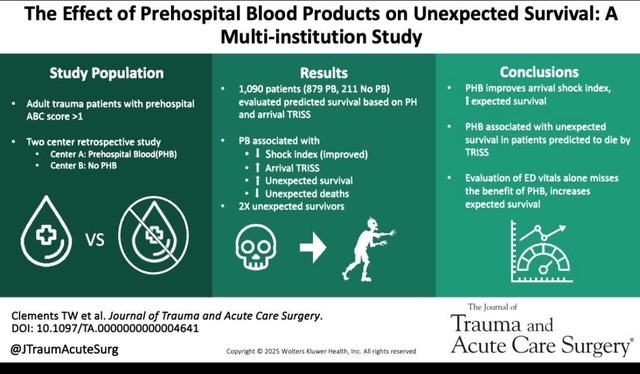 Clements TW, Van Gent JM, Krzyzaniak A, Campbell B, Carroll A, Mericle M, Sise M, Peck KA, Cotton BA. The effect of prehospital blood products on unexpected survival: A multi-institution study. J Trauma Acute Care Surg. 2025 May 2. doi: 10.1097/TA.0000000000004641. Epub ahead of print. PMID: 40312787.