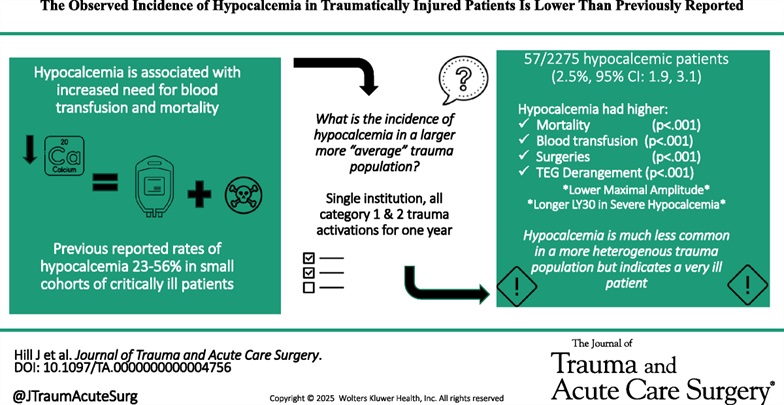Hill, Joshua H. MD; Shah, Bhairav DO; Rady, Emily MD; Lieber, Michael MS; Lauria, Julia DO; Lee, Katarina DO; Wierzbicki, Katrina BS; Kashikar, Tanisha DO; Kincaid, Michelle MD. The observed incidence of hypocalcemia in traumatically injured patients is lower than previously reported. Journal of Trauma and Acute Care Surgery 99(6):p 920-927, December 2025. | DOI: 10.1097/TA.0000000000004756