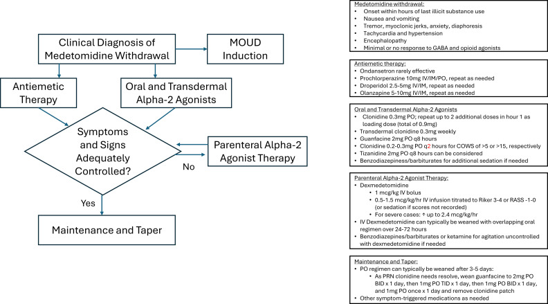 The US drug supply has been found to contain medetomidine as an adulterant to heroine/fentanyl. It is a potent tranquilizer used in animals. It is an alpha 2 blocker (similar pharmacology to clonidine and xylazine). Exposure to this drug can induce withdrawal symptoms to include anxiety, tremor, diaphoresis, nausea, vomiting, agitation, sympathetic hyperactivity, and delirium. Withdrawal can start within 4-6 hours of last use.